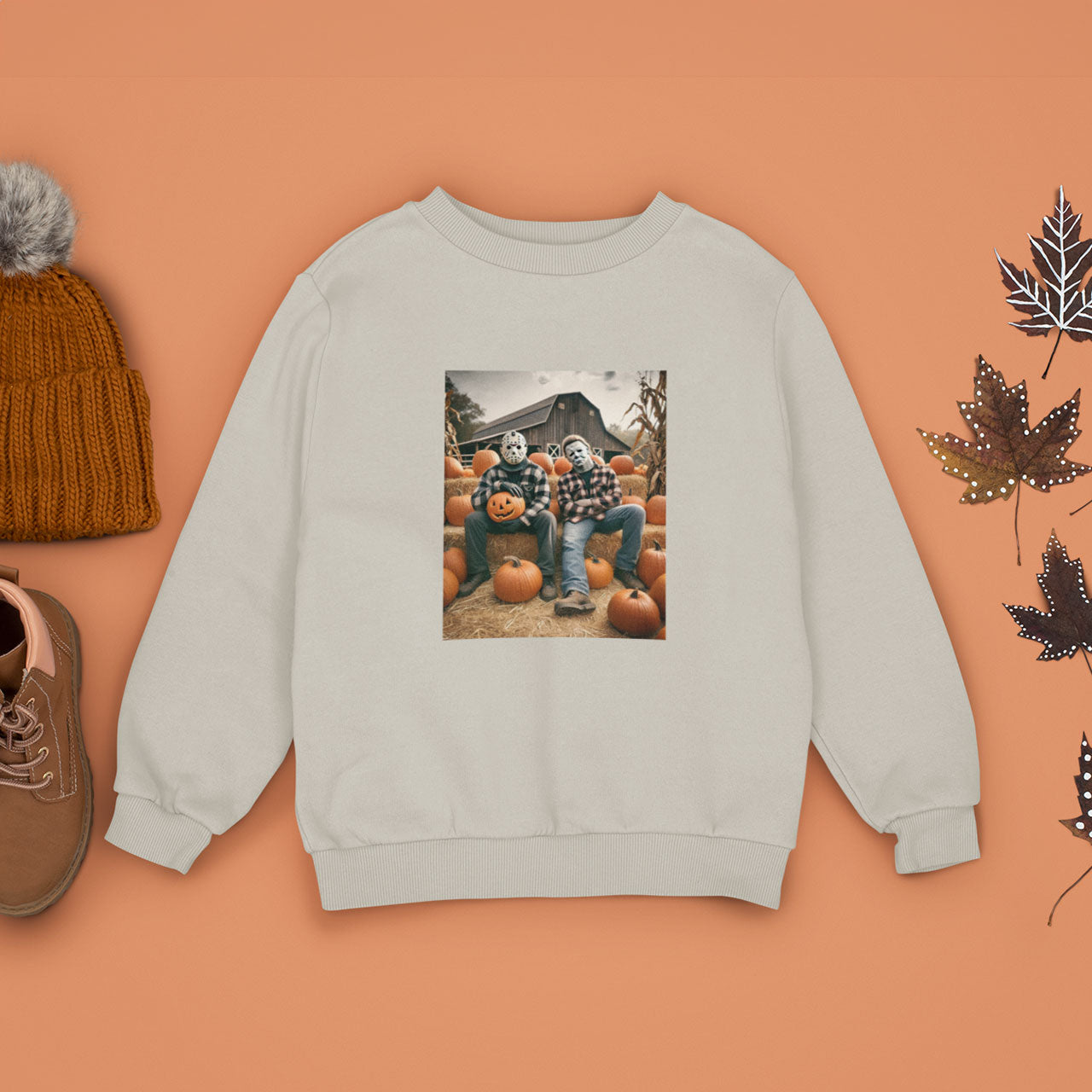 Get cozy with a killer fall vibe! This sweatshirt showcases Jason and Michael Myers in a rare moment of peace, hanging out in a pumpkin patch, decked out in classic flannels. This design blends spooky and humor perfectly. Ideal for horror fans who love a twist on Halloween classics. Stay warm, stay spooky!