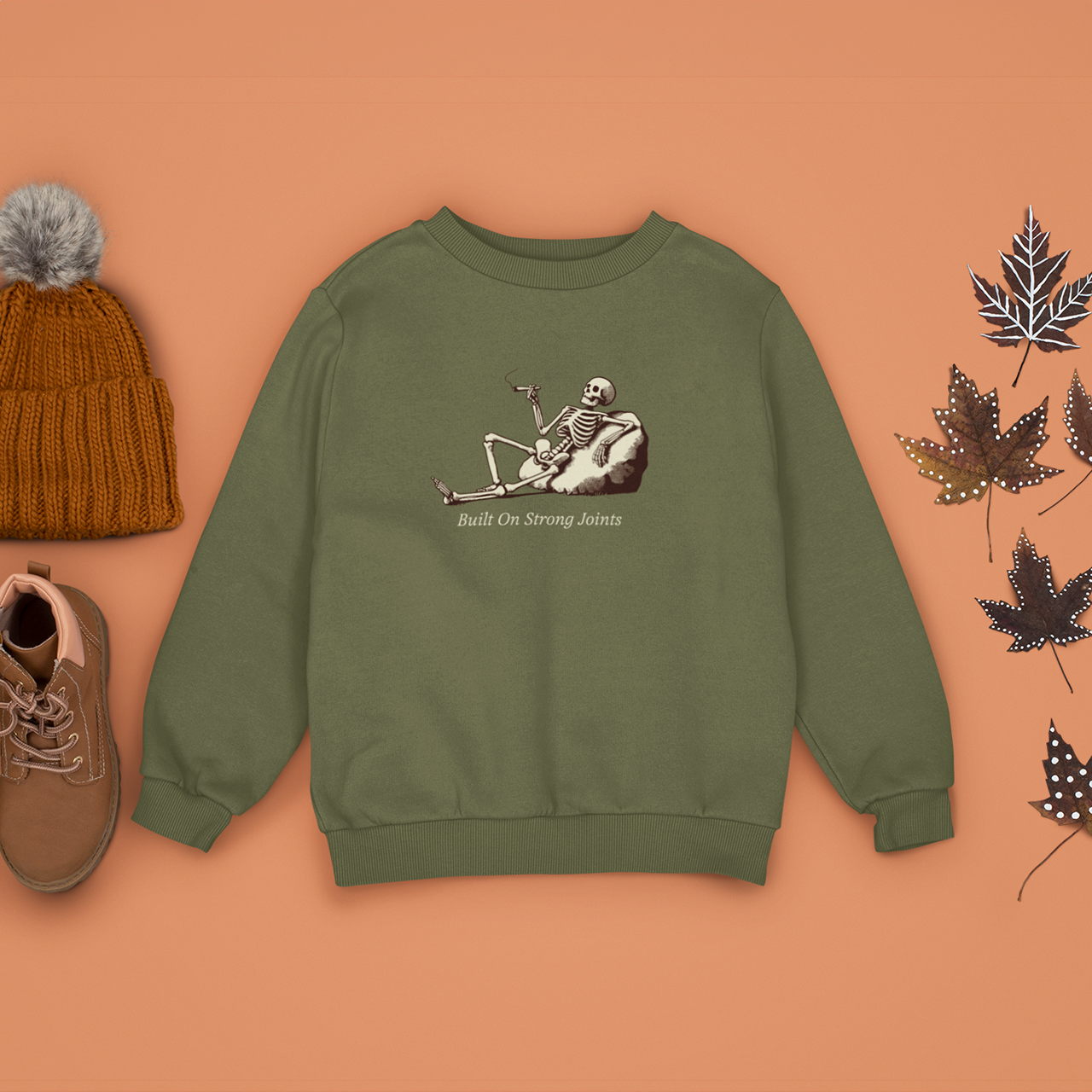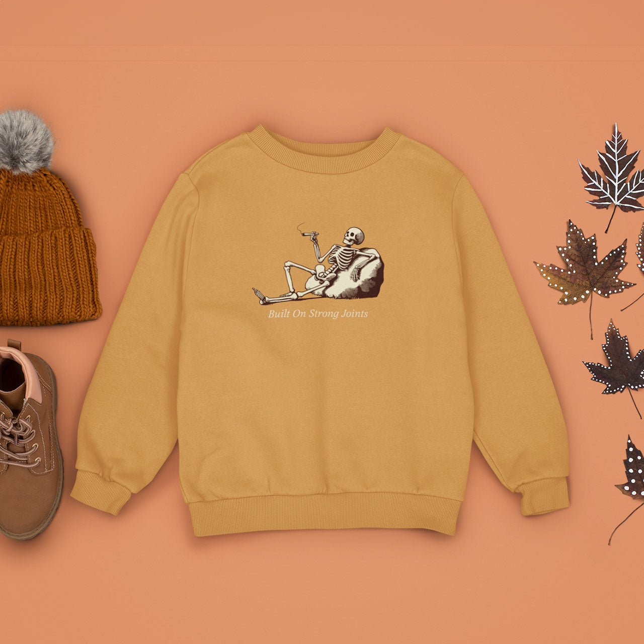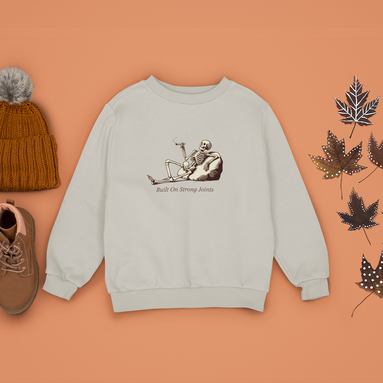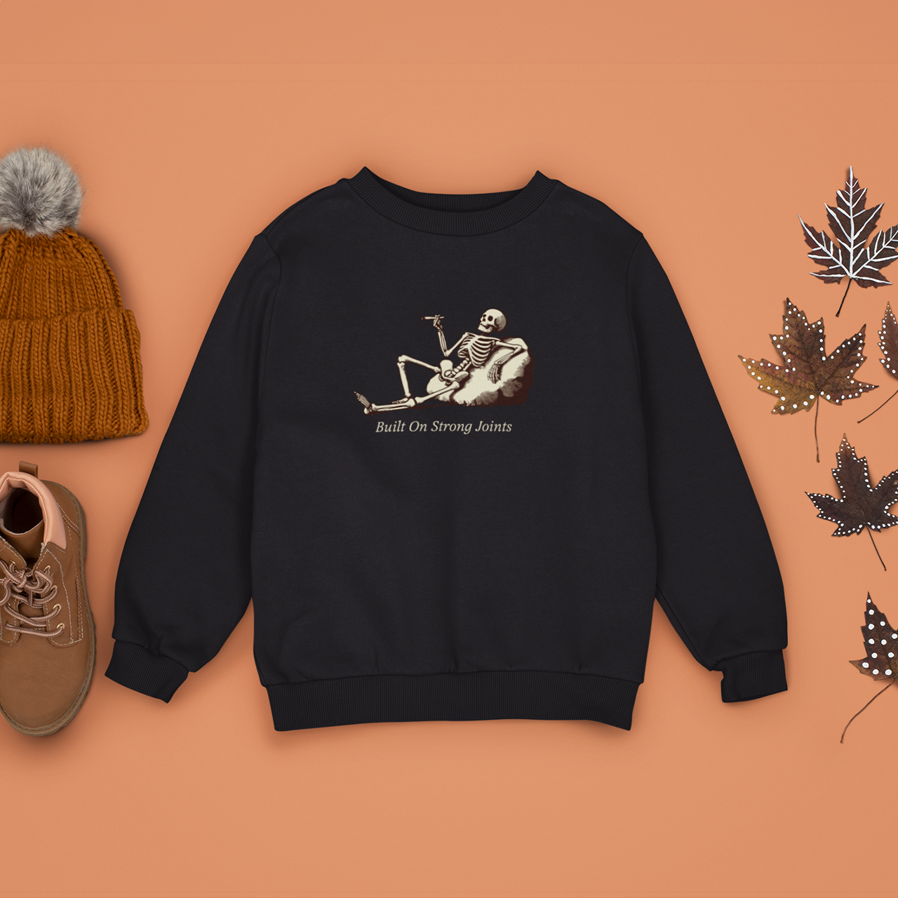 This skeleton’s got his priorities straight—built on strong joints, and stoned to the bone, literally! Featuring a laid-back skeleton enjoying a smoke, this sweatshirt blends humor with a chill vibe. Perfect for anyone who loves a good pun and some relaxed Halloween spirit.